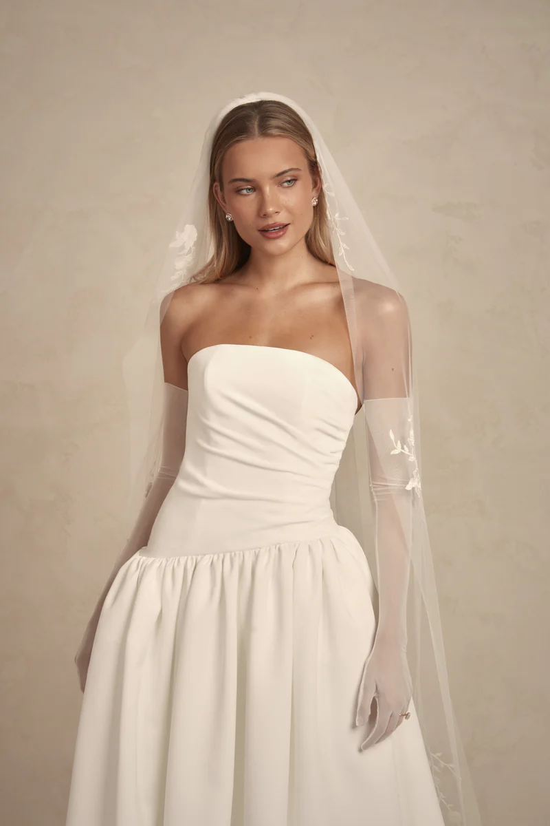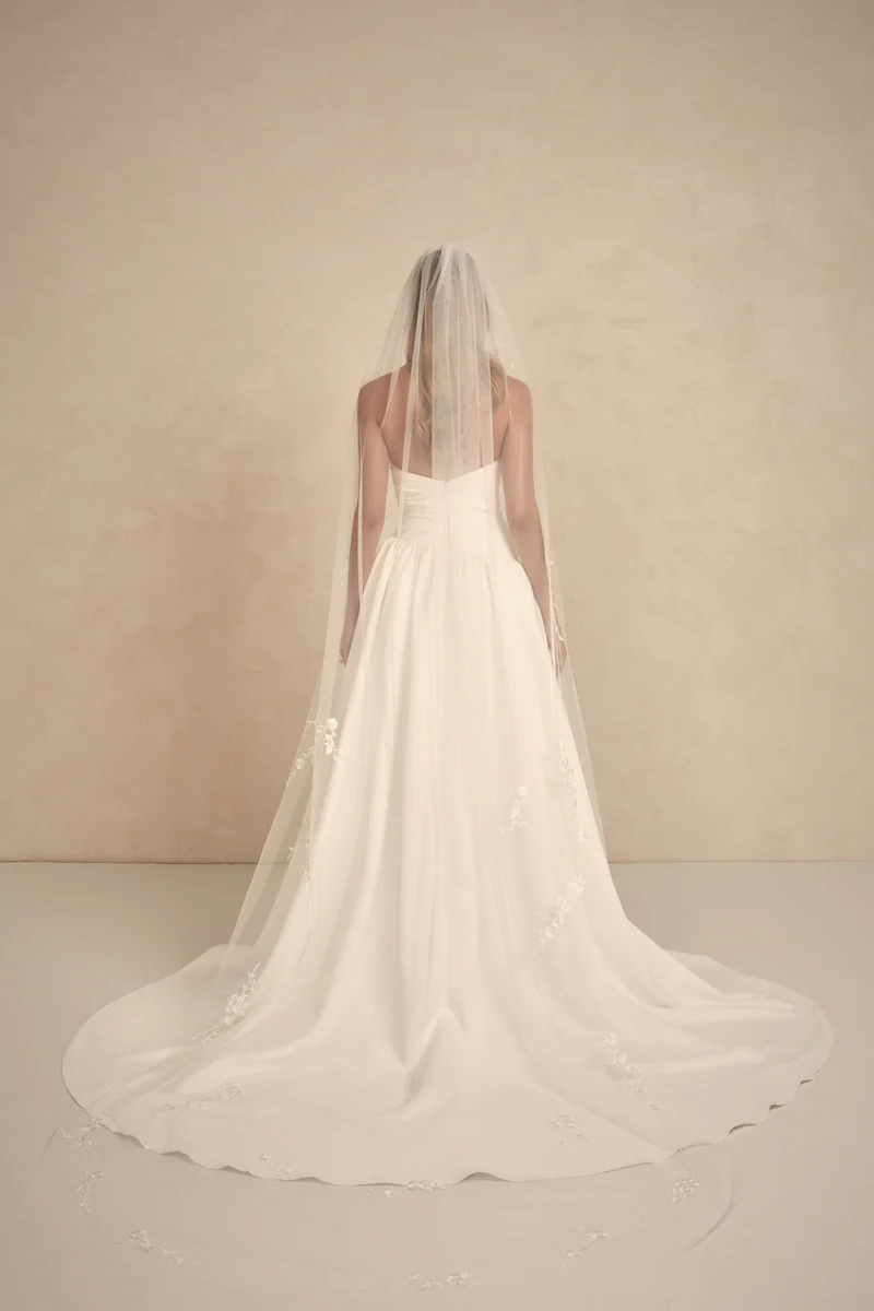 A delicate tulle bridal veil adorned with beautiful intricate lace details. Soft and romantic, this the Aria Veil adds the perfect touch of timeless elegance to any wedding look.