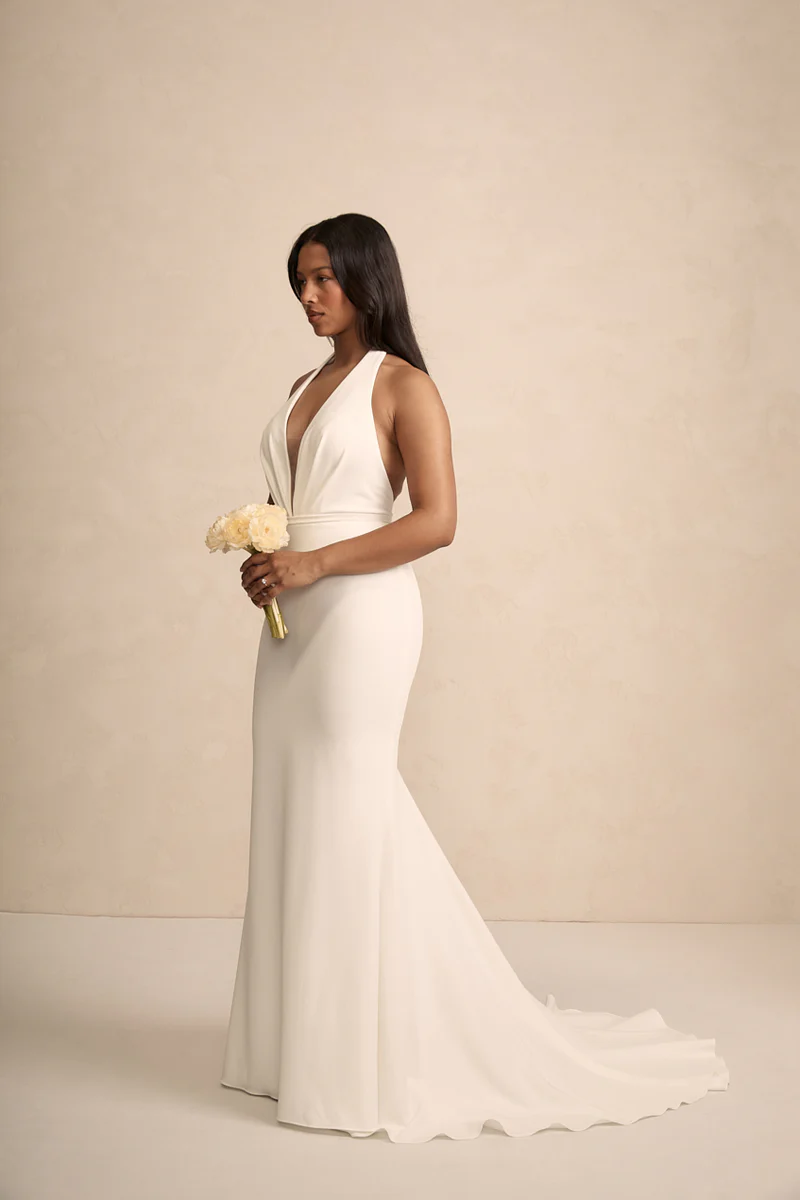 Audrey blends a striking backless design with MWL’s iconic plunging neckline and a removable crepe belt for a subtle cut-out effect. Crafted from supportive French Crepe, Audrey hugs curves beautifully and is comfortable for both the aisle and the dancefloor.k.