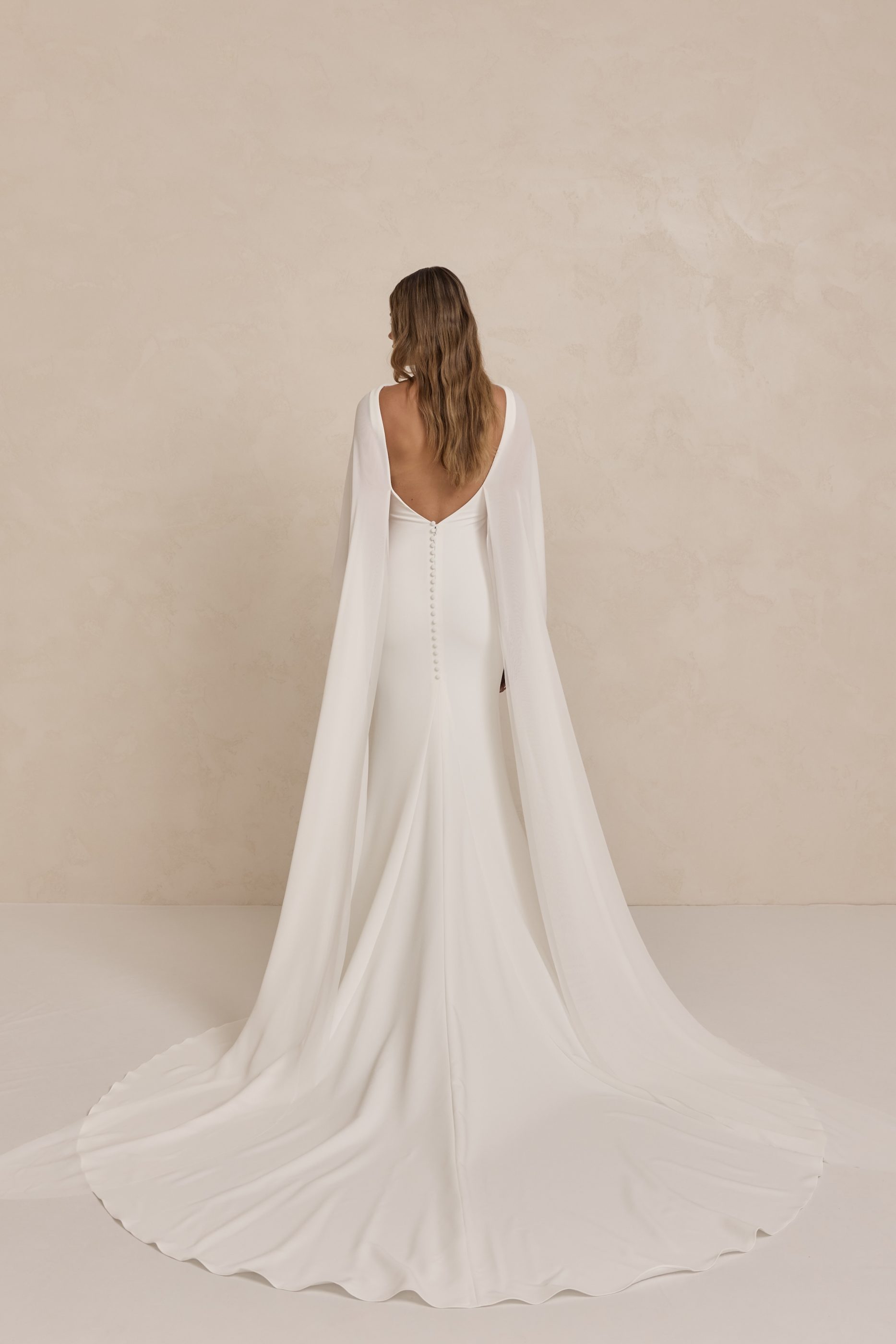 Crafted in our signature sleek crepe, Gatesoffers a sleek, sculpted silhouette that flows into the timeless Gracie skirt pattern. The design features a striking low back, adding a bold, sensual edge to its otherwise understated elegance.Gates is accented with a soft chiffon scarf that can be styled as a delicate wrap or draped effortlessly over the shoulders for a romantic finish.