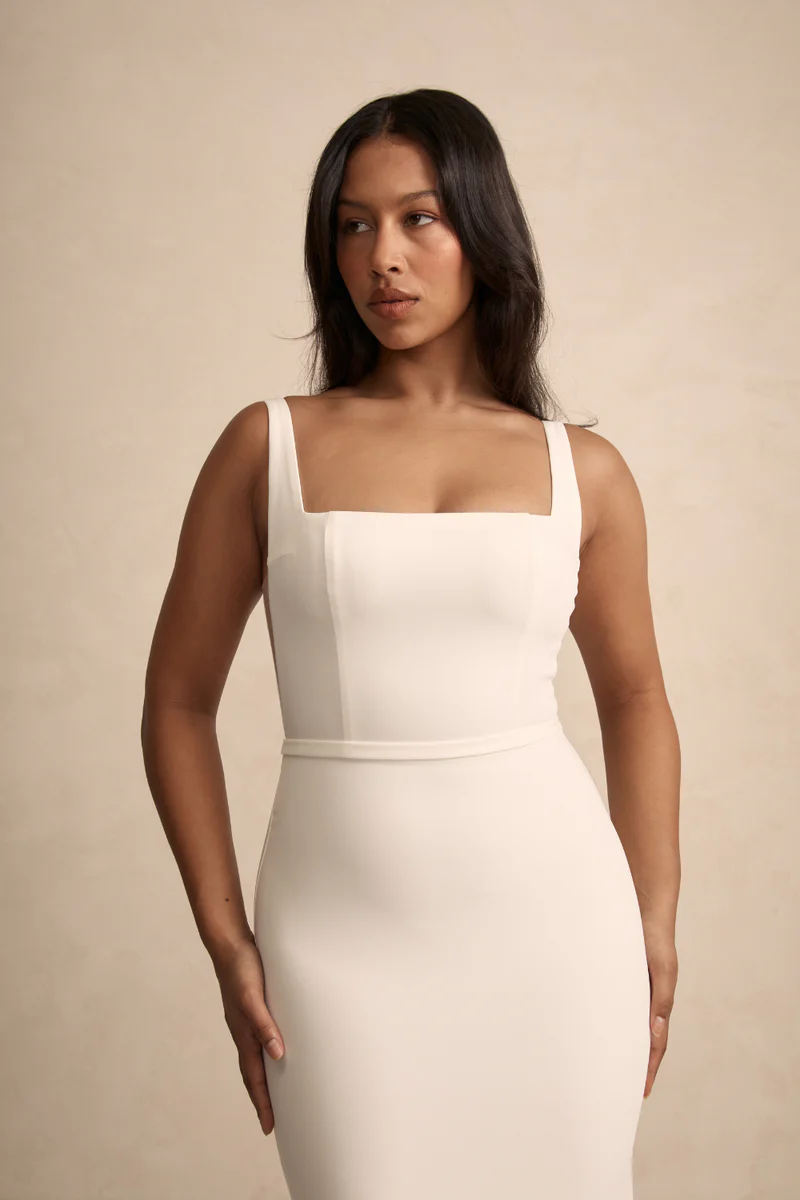 Hunter features a highly requested square neckline, illusion tulle cut-outs, and a higher square back with figure-flattering buttons. Crafted from iconic French crepe, this design beautifully frames the bust, offering a flattering look for all MWL brides.