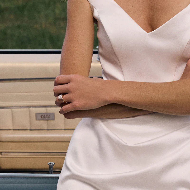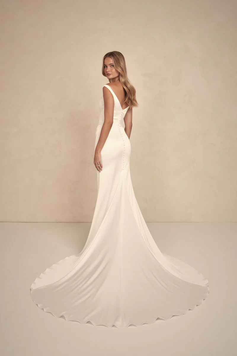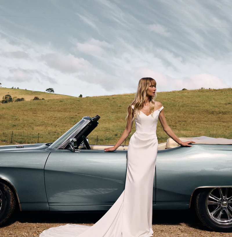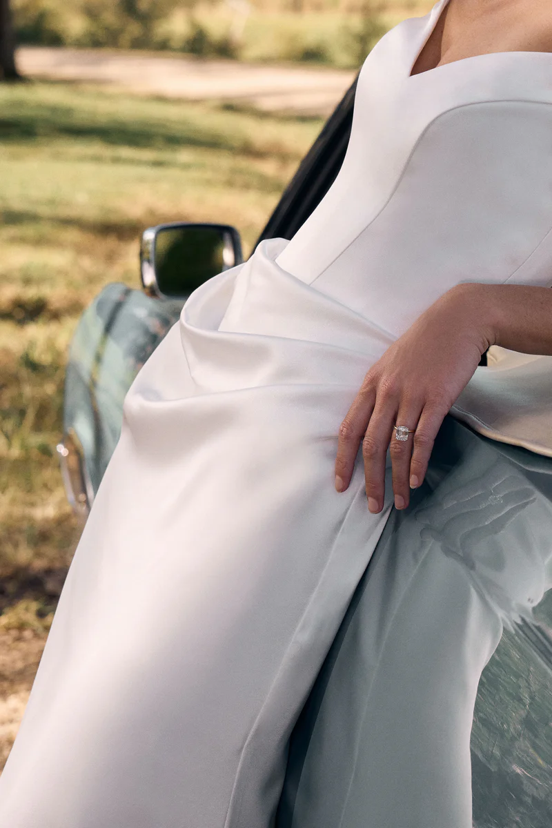 Isla is a love letter to the past, reimagined for the modern bride. Crafted in our iconic luxurious satin, it features a feminine off the shoulder sleeves that flatter and are undeniably romantic. The delicate ruche detail at the waist is artfully balanced to the side and creates a silhouette that feels both statuesque and unexpected. A long, elegant train pays homage to a whisper of old-world elegance