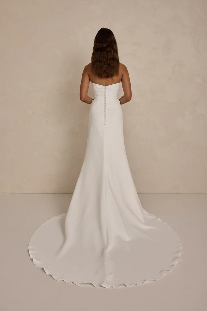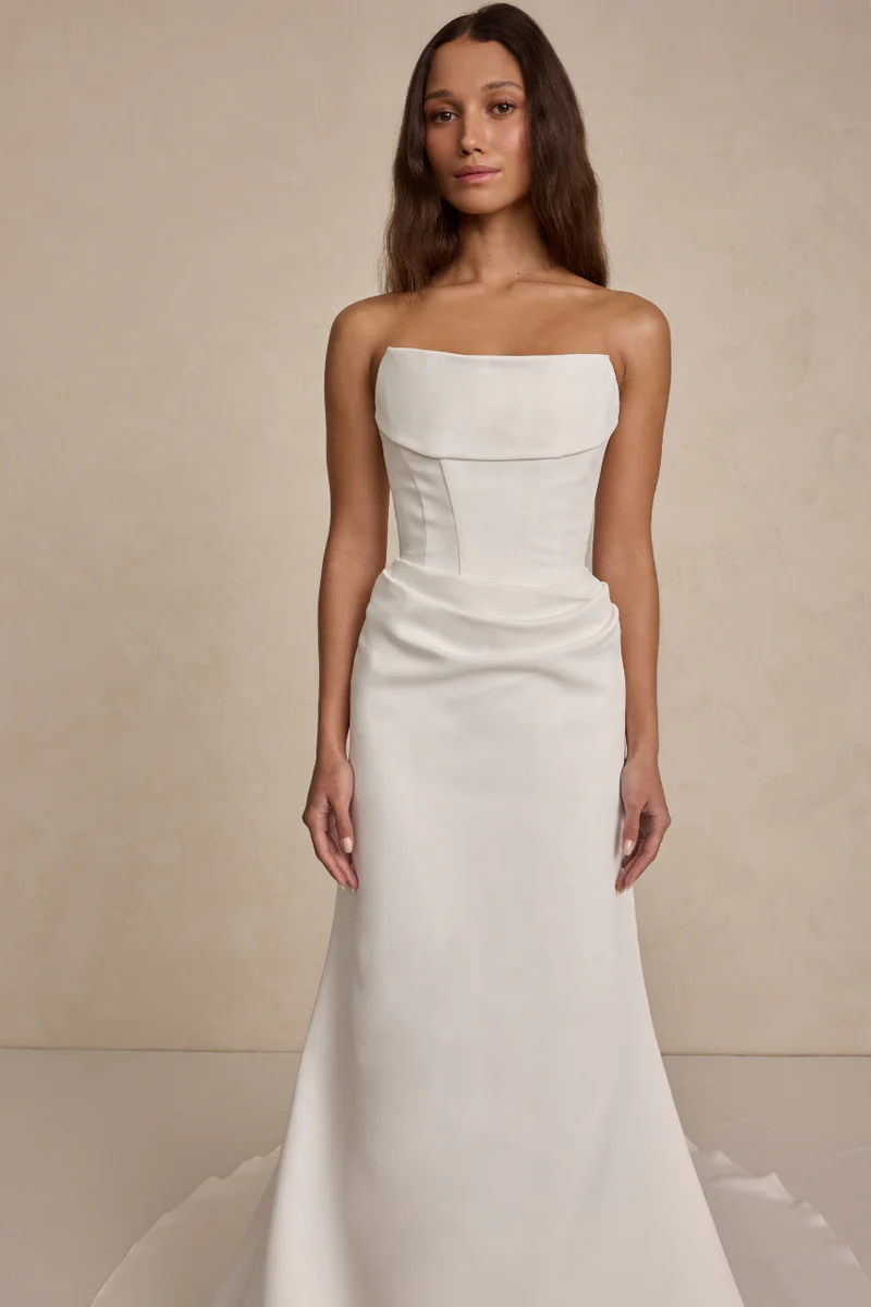 Elegant and architectural, the Knox is a fresh take on timeless sophistication. Featuring a newly developed bodice pattern inspired by our iconic Celine dress, Knox offers a refined silhouette with internal boning for structure and support. A soft, sculptural cowl detail graces the front bodice, adding a touch of modern romance.