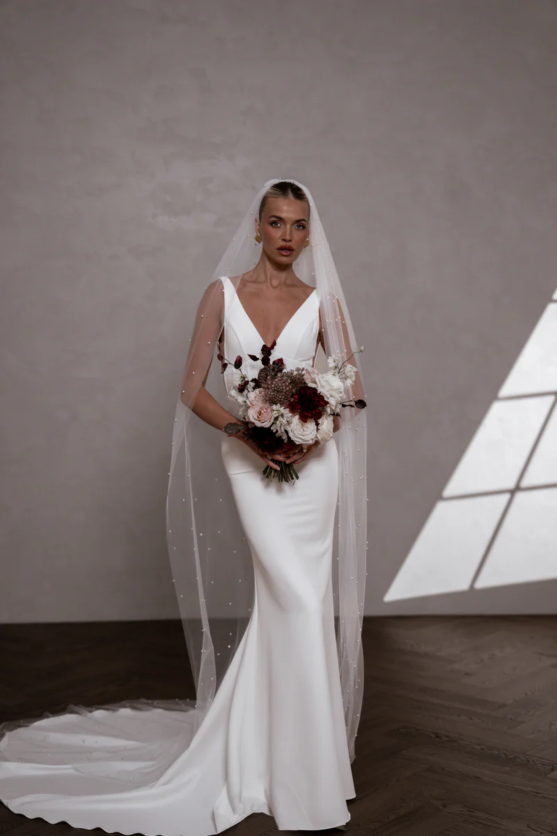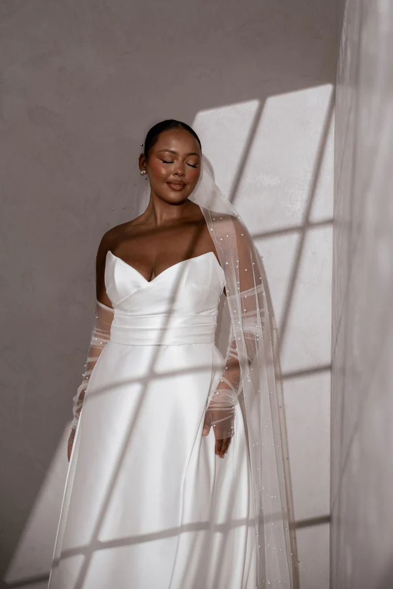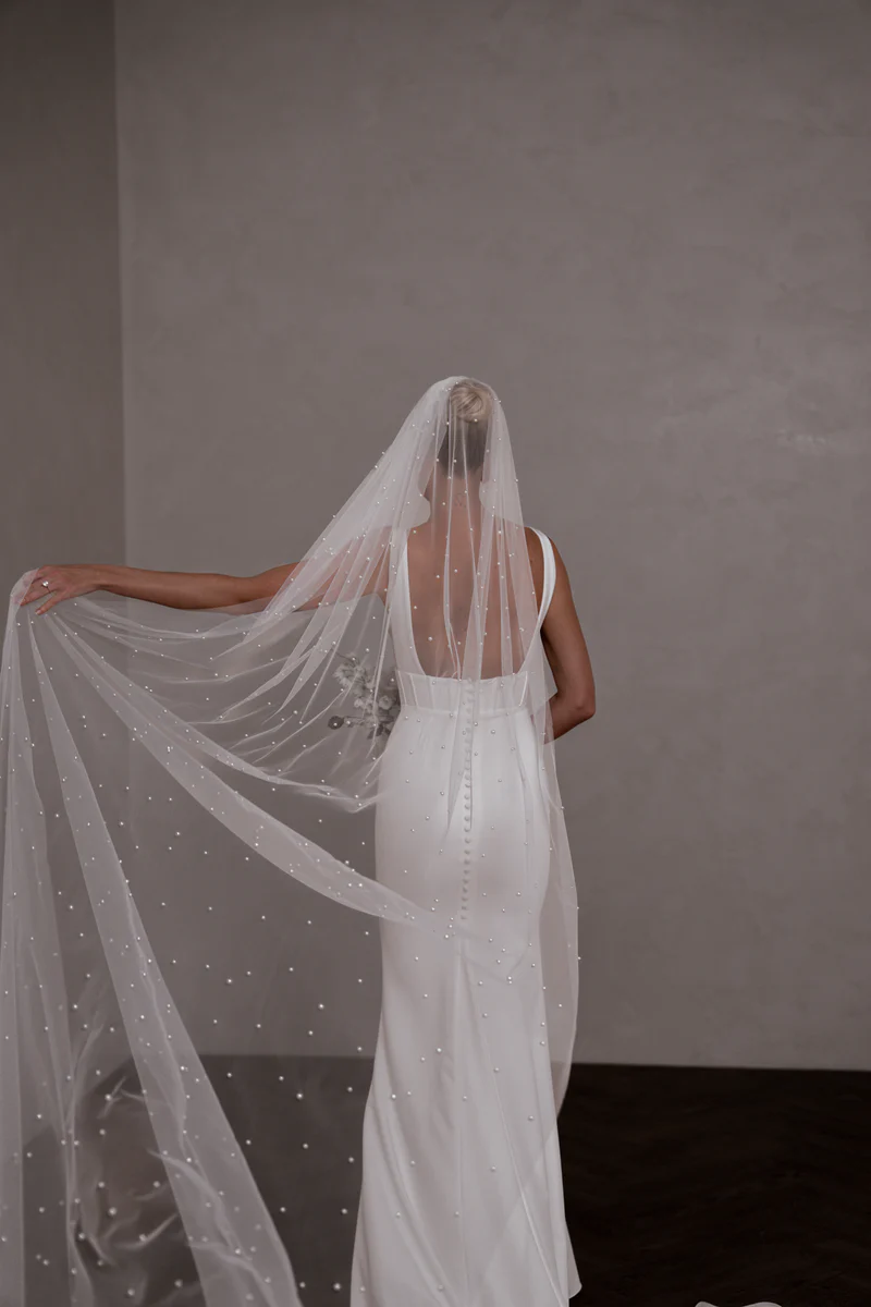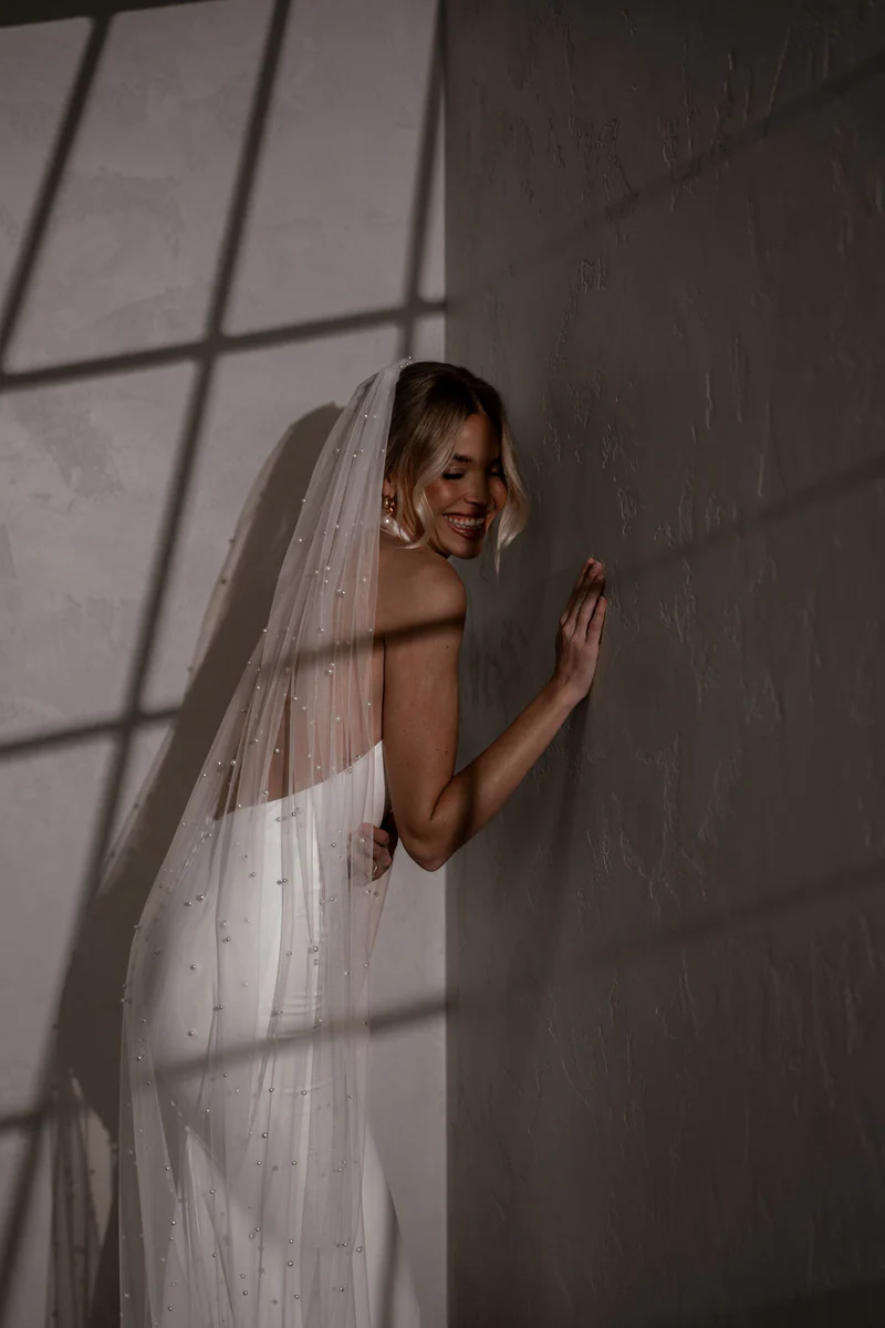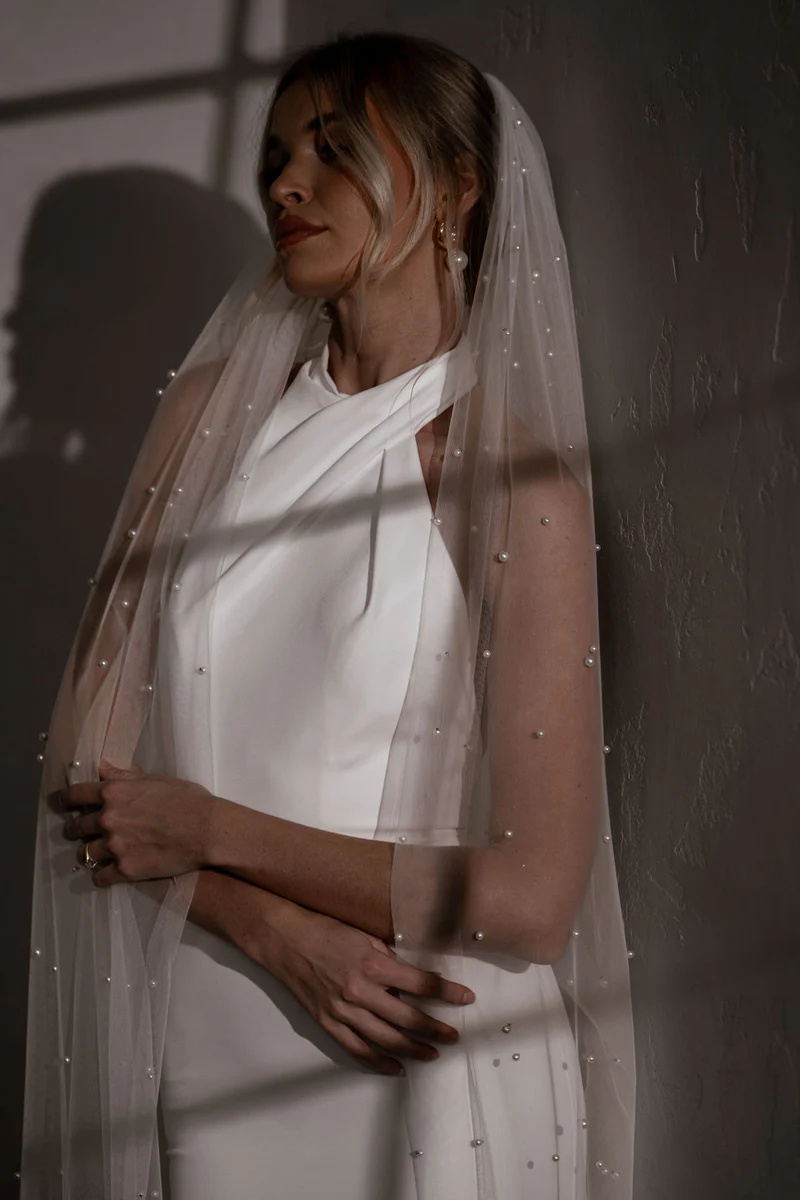 Delicately adorned with cascading faux pearls across soft ivory tulle, this veil effortlessly combines the perfect balance of sophistication and modern romance. Our Pearl Veil is the perfect finishing touch for your wedding day look.