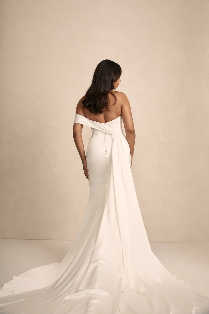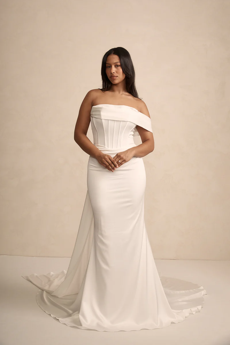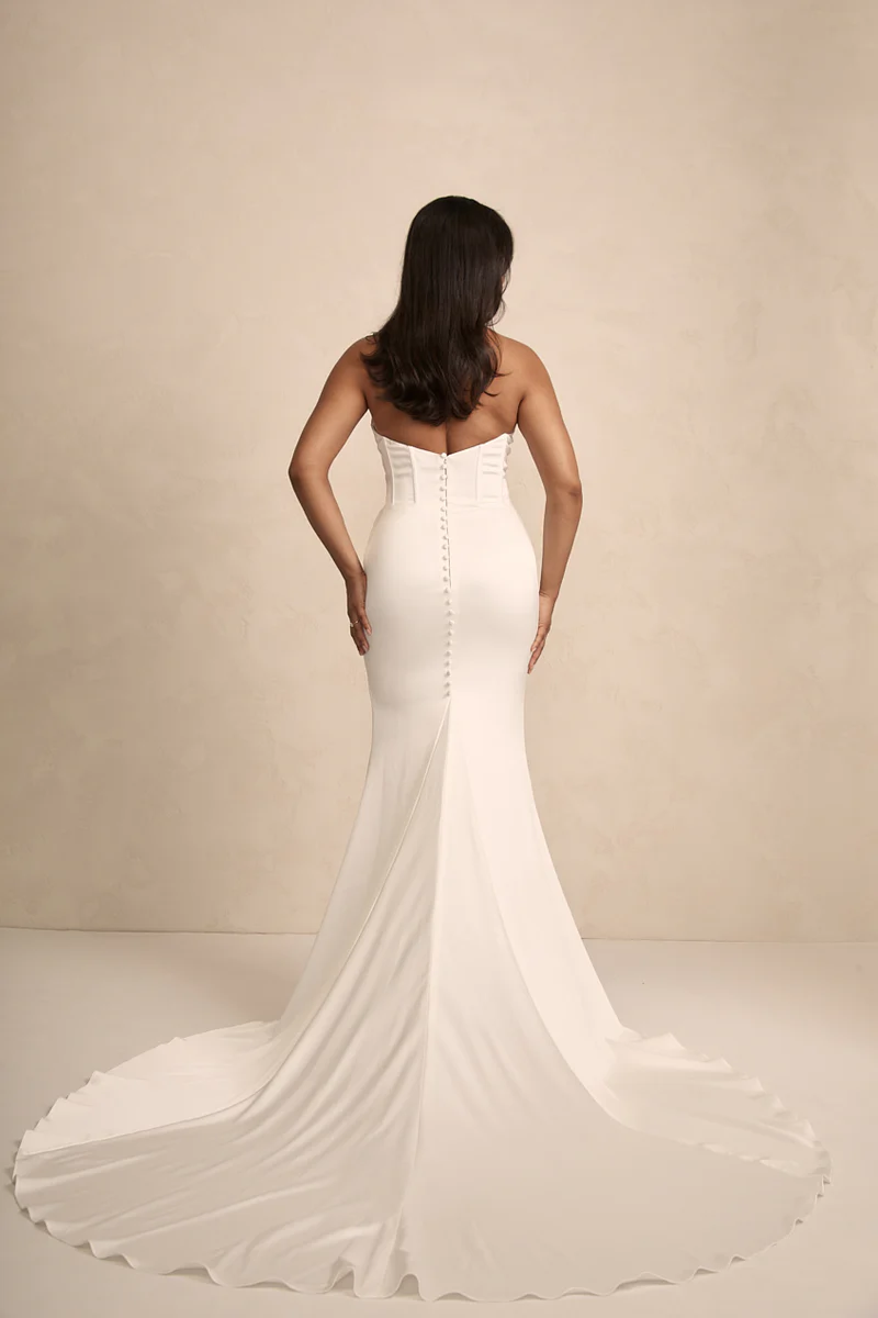 Rhode Satin is breathtaking strapless satin wedding dress that effortlessly combines modern elegance with timeless romance. The striking bodice features a peaked design at the bust with statement exposed boning, sculpting your silhouette with an alluring yet refined edge.