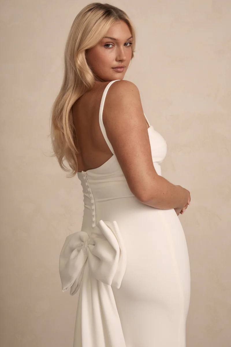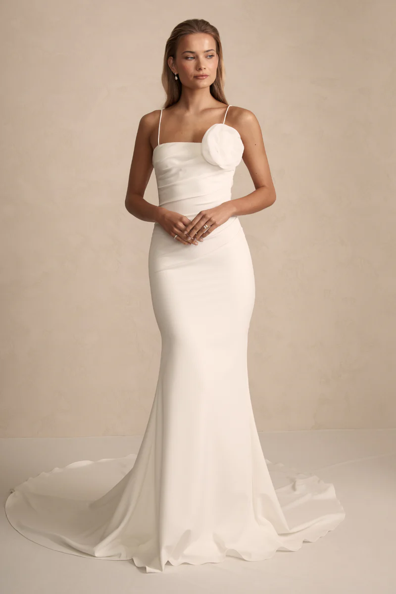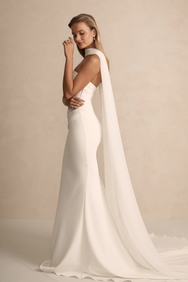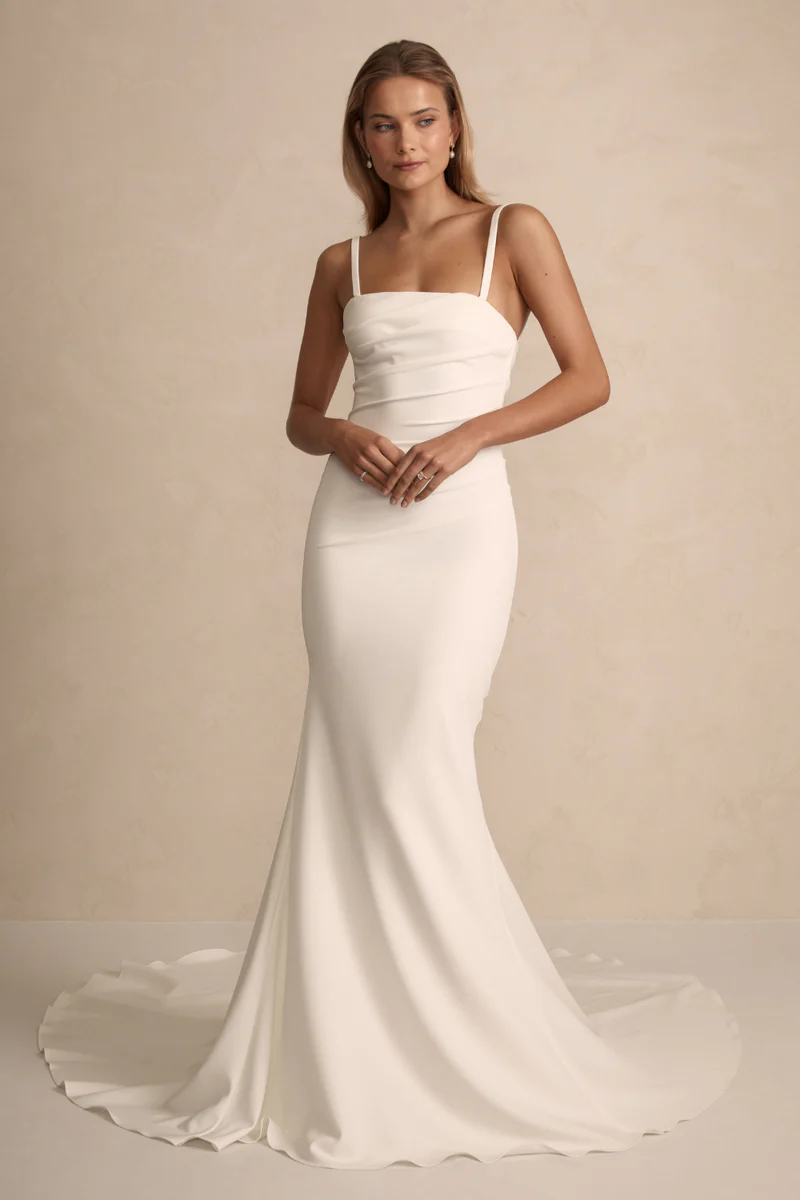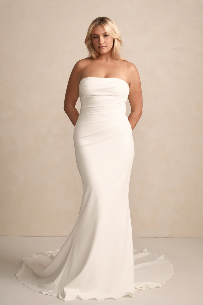 Crafted from luxurious crepe, Sawyer is designed to flatter all figures with its artfully placed pleats along the front and back panels.  Choose from thick or thin straps, or embrace the elegance of going strapless.