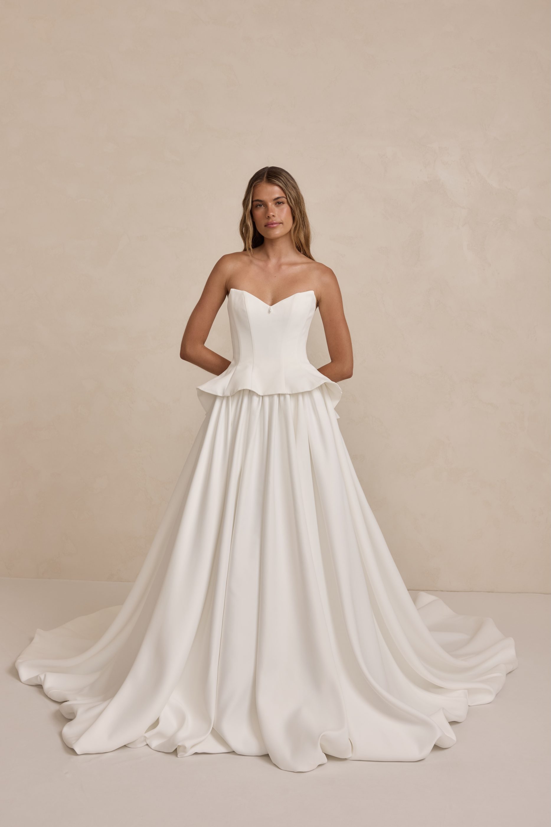 The Tanner combines modern femininity with thoughtful structure. The bodice features a flattering peplum silhouette, designed to enhance the waist and create a soft, romantic shape. For added versatility, the bodice is available as a detachable piece or can be ordered fully attached for a seamless look. Made from our luxurious Avery Satin, the skirt flows beautifully and is finished with a bagged out bubble hem, adding subtle volume and a touch of drama. Inside the bodice, interfacing provides extra support, ensuring a secure and elegant fit all day. A delicate teardrop pearl at the centre of the neckline adds the perfect finishing detail.