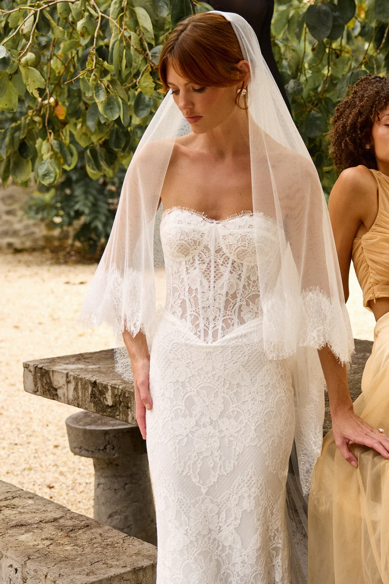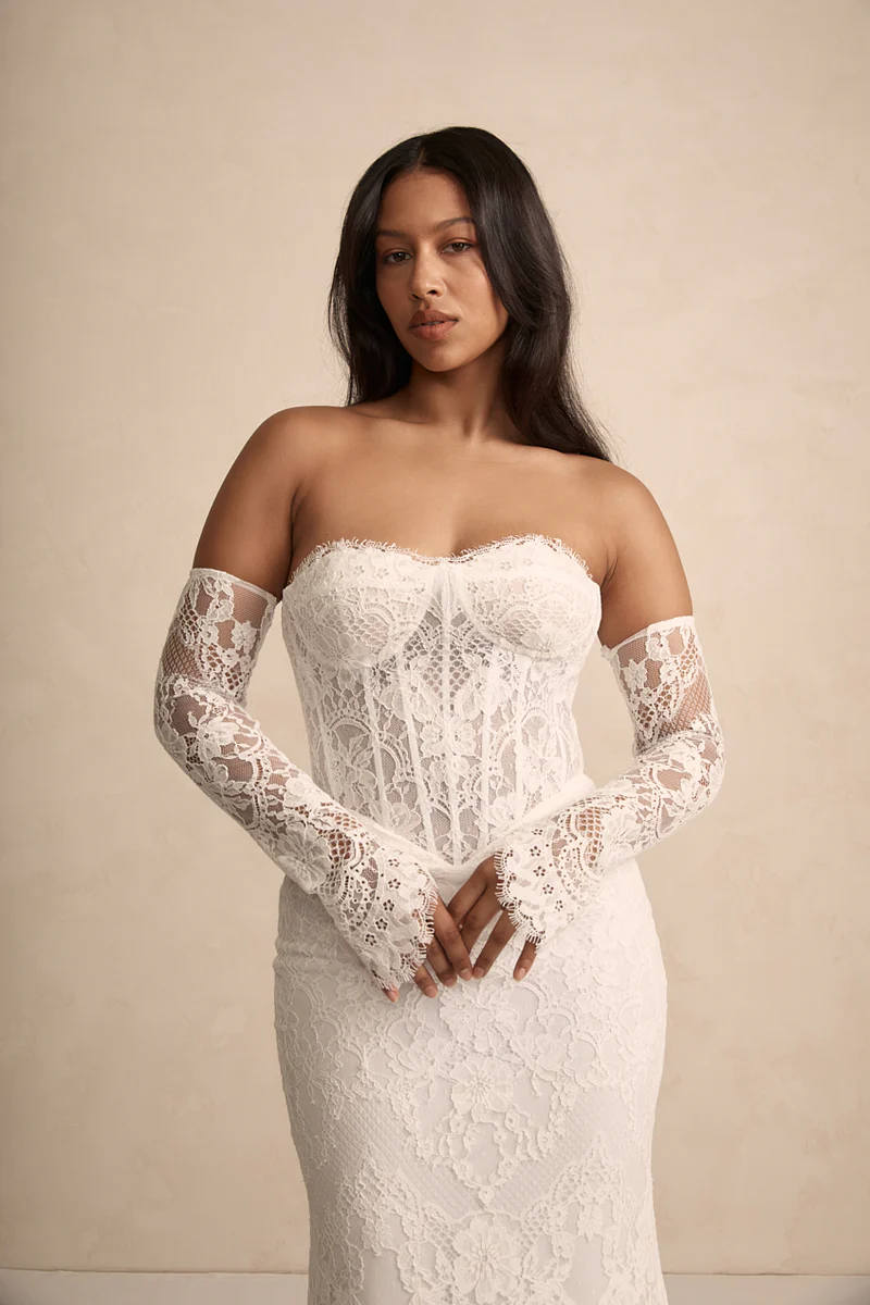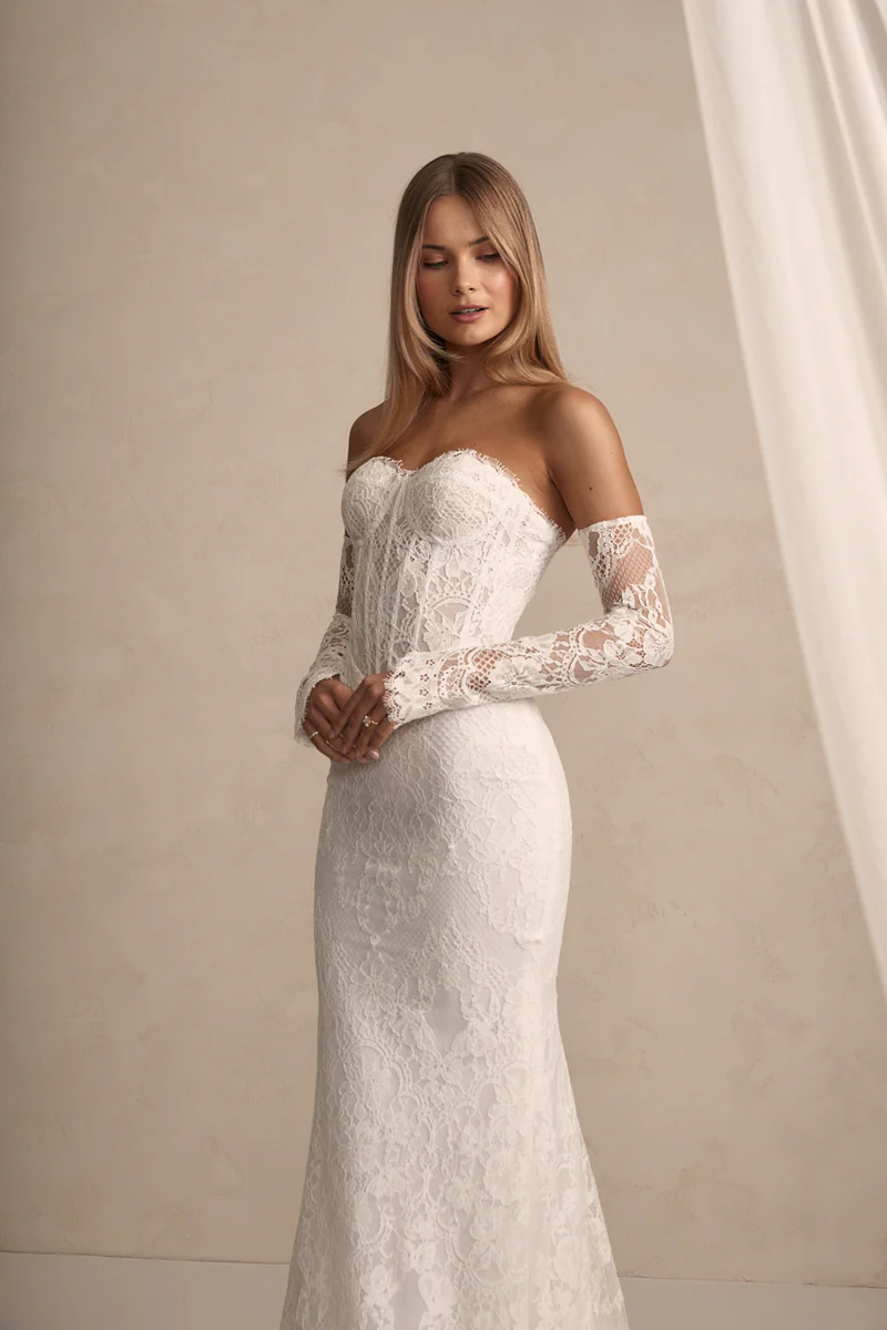 Winnie’s intricately beautiful Chantilly lace with stunning eyelash edges truly shines in both our classic ivory or modern sand colour-ways. Paired with her sheer removable sleeves and contouring bodice boning, she is a beauty that is sure to endure the test of time, giving a nod to tradition, yet fiercely embraces modern trends.
