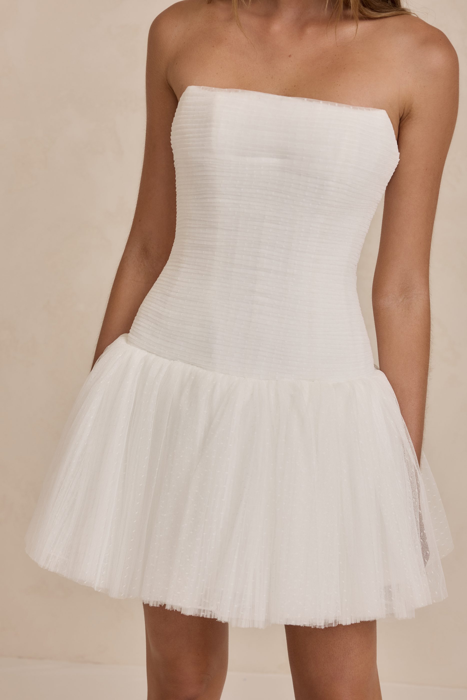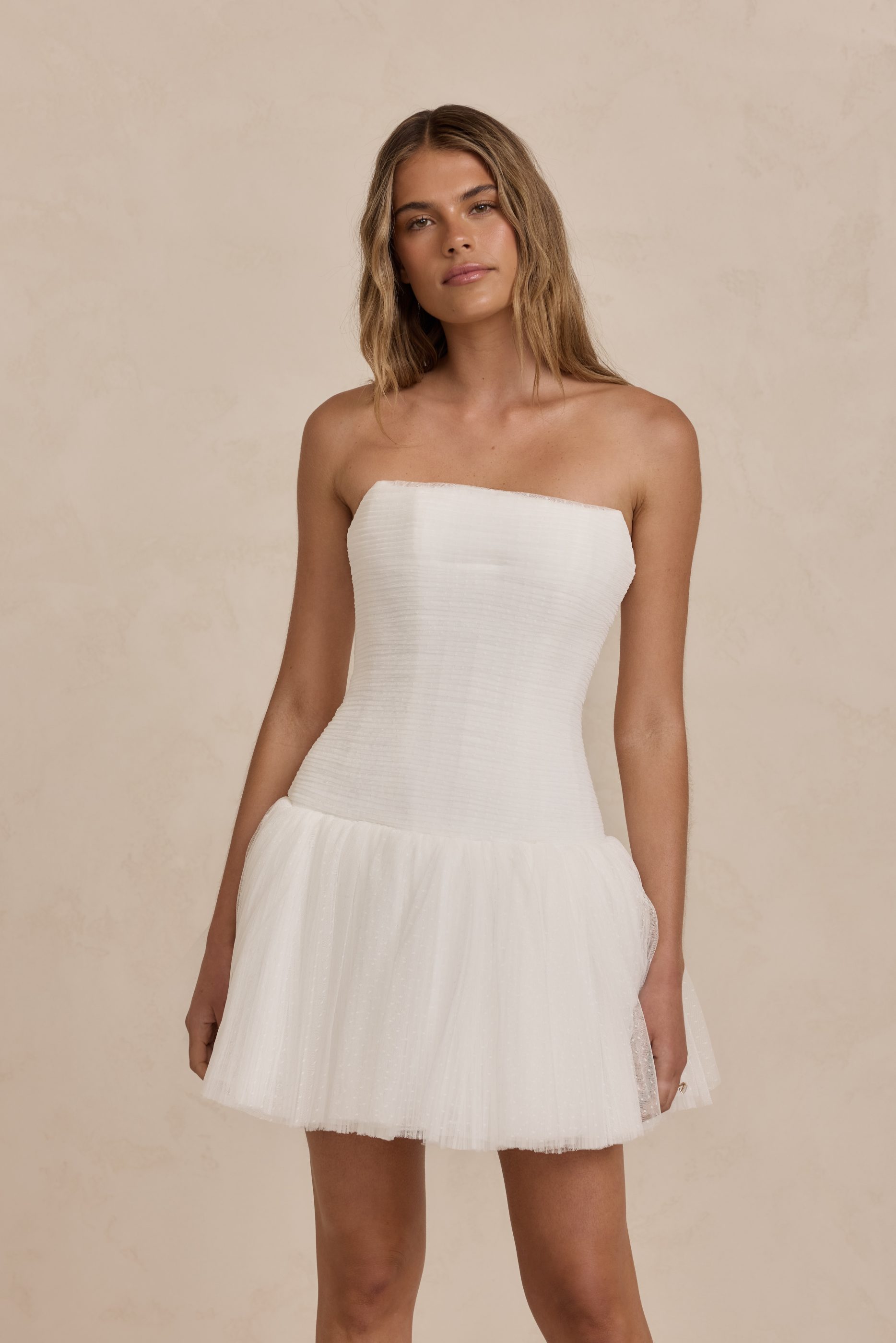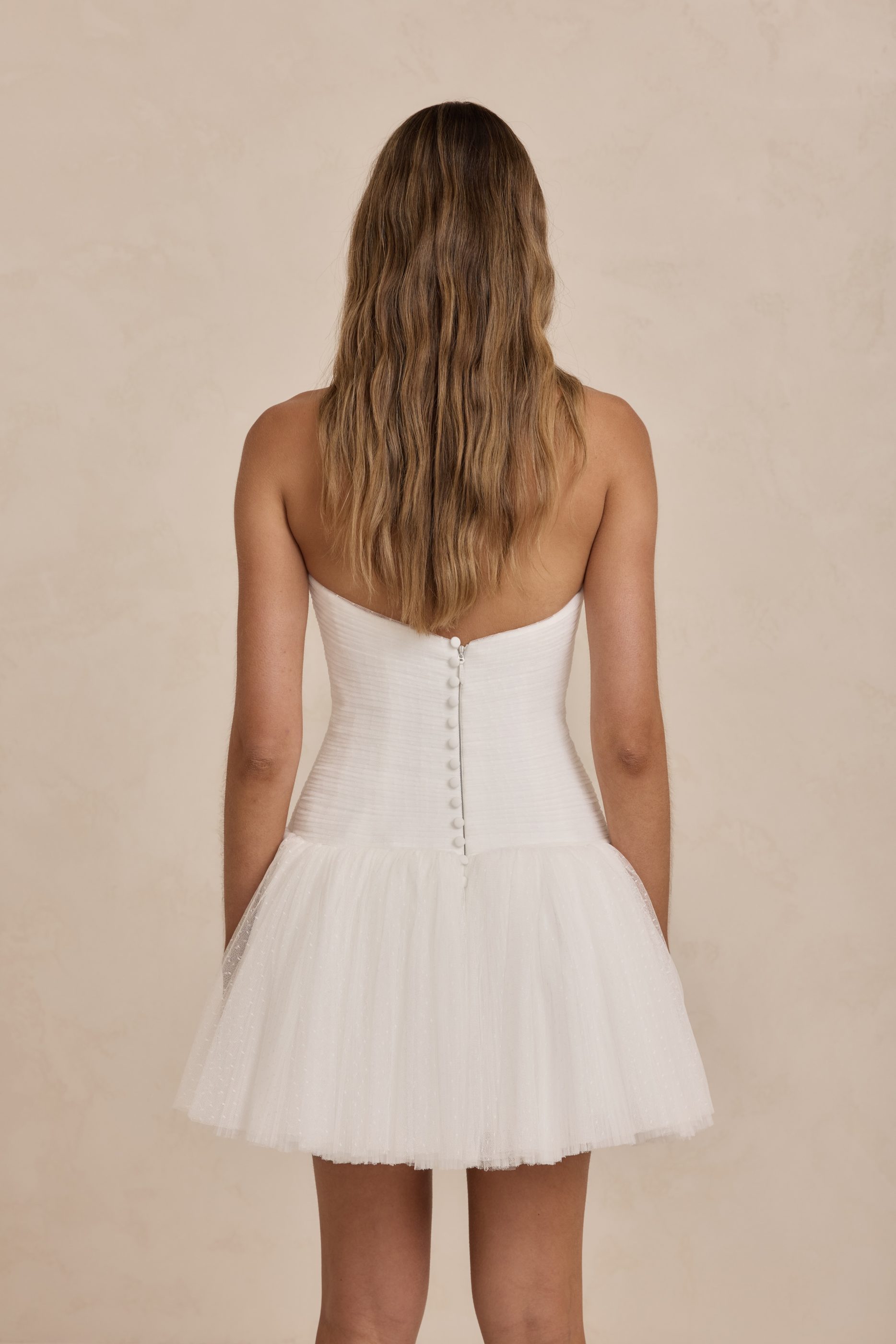 Her bodice features a graceful straight neckline and a flattering low drop waist, designed to elongate the figure. Inside, subtle boning adds gentle structure and support, offering a balance of comfort and elegance. The spotted tulle mini skirt dances with every step, adding a sense of whimsy and celebration.