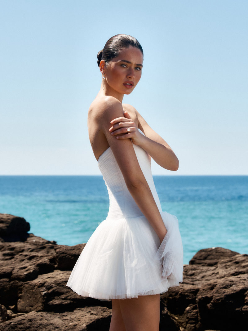 The Zeke Mini is a playful yet romantic piece, crafted from soft pleated spotted tulle that brings lightness, texture, and charm to every detail. Sharing the same delicate fabric as the Banks and Jean gowns, Zeke captures the spirit of movement and joy in a fresh, flirty silhouette.